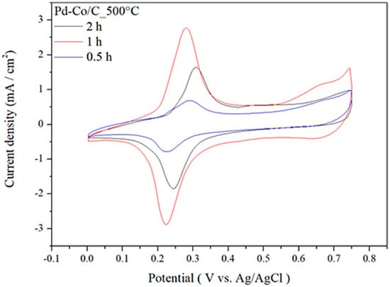 Cyclic voltammograms of Pd-Co/C catalyst at annealing temperature of 500 °C under annealing residence time of 0.5, 1, and 2 h.