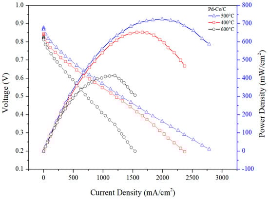 The AEMFC tests are shown in Figure 8 and Table 9. The Pd-Co/C cathode catalyst annealed at a temperature of 500 °C, for a duration of 1 h with a loading of 0.25 mg/cm2, yielded the optimal performance of the fuel cell with an impressive power density of 724 mW/cm2. This performance is significant and cost-effective in comparison with previous research works provided in the literature, as shown in Table 10.