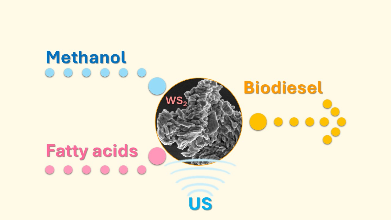 | WS2 | 16 wt% | Oleic + linoleic acids (85:15) | 1:15 | 75 | 1 h | US bath, 80 kHz, 320 W | 95 | This study |