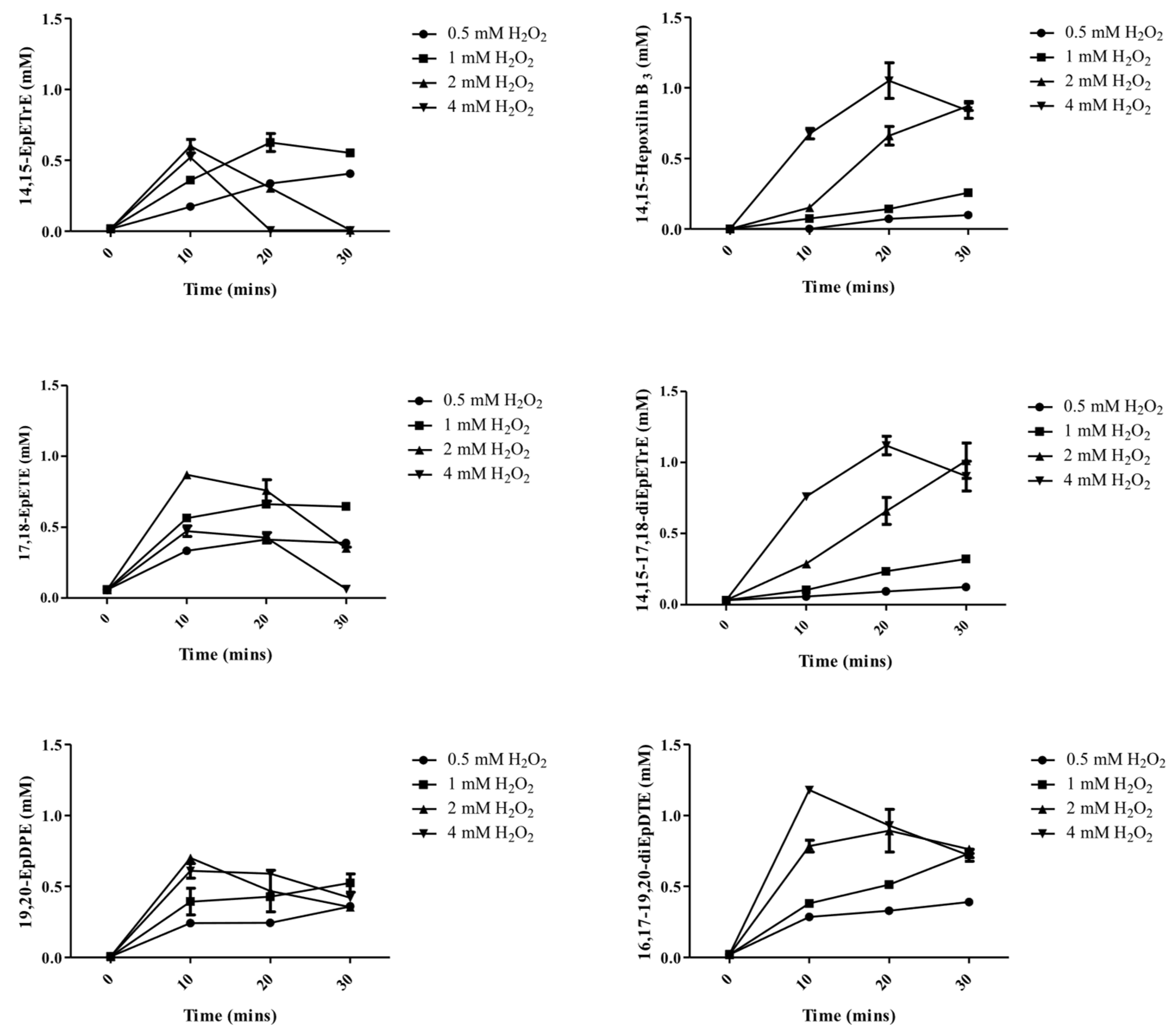 - VanderNoot, V.A.; VanRollins, M. Capillary Electrophoresis of Cytochrome P-450 Epoxygenase Metabolites of Arachidonic Acid. 2. Resolution of Stereoisomers. Anal. Chem. 2002, 74, 5866–5870. [Google Scholar] [CrossRef]