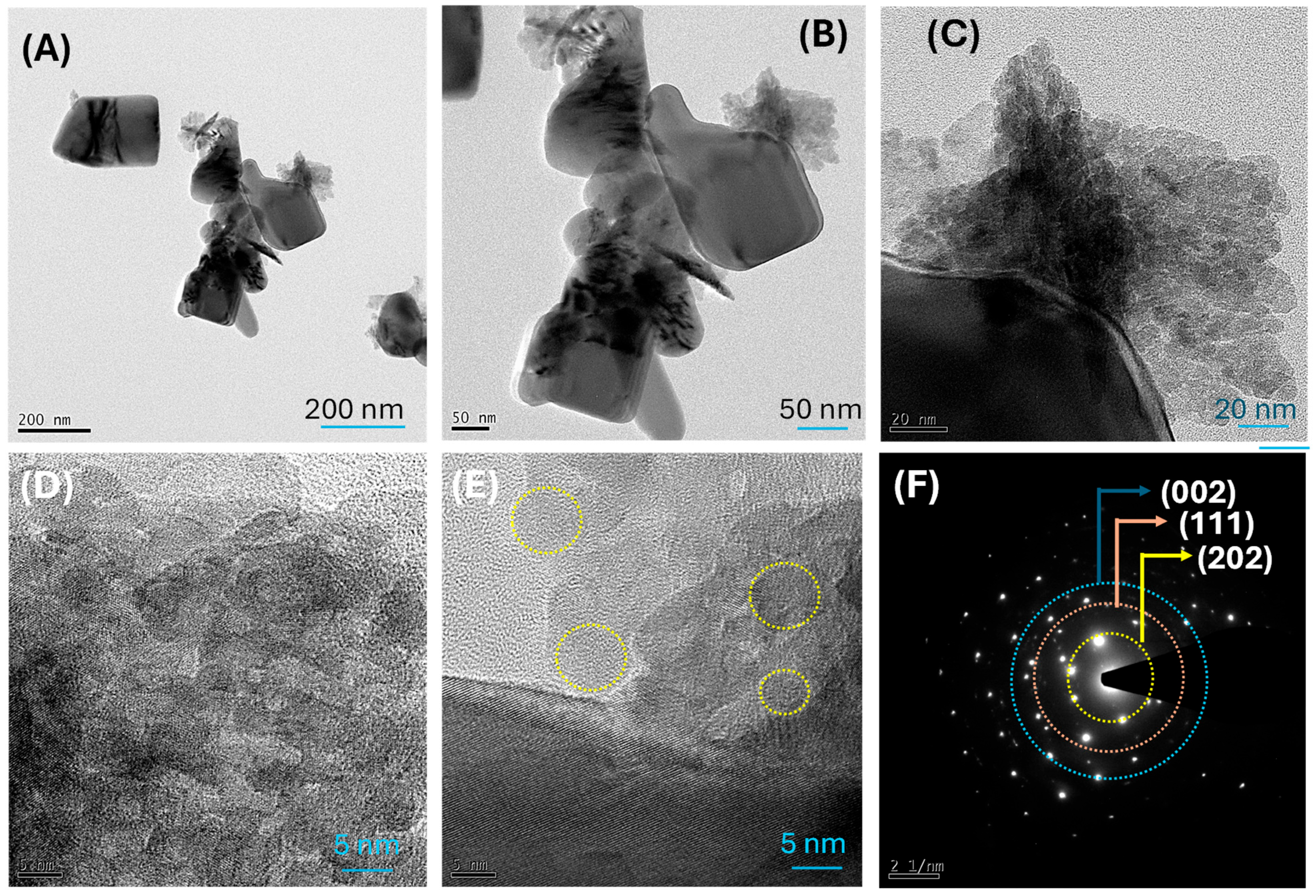2.6. Transmission Electron Microscopy (TEM) and SAED Analysis: Resolving Primary and Secondary Particle Size