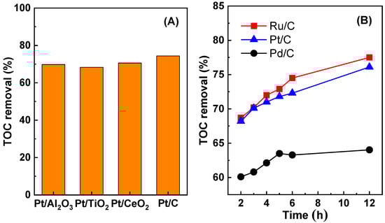 Except for supports, the active metals on catalysts also affected catalytic performance greatly. To study this effect, Ru/C and Pd/C were prepared and investigated for CWAO of reconstituted tobacco wastewater at 220 °C and 3.0 MPa. The results are illustrated in Figure 1B, where TOC removal of Pt/C catalyst was also presented for the sake of comparison. Among these three catalysts, Pd/C behaved the poorest catalytic performance, as TOC removal was only 64.3% even after 12 h reaction, while Ru/C and Pt/C showed similar initial activity. However, Ru/C exhibited higher TOC removal than Pt/C after a 4 h reaction, and TOC removal of Ru/C and Pt/C was 77.5 and 76.1%, respectively, after 12 h reaction. In the comparison to Pt and Pd, Ru is reported with higher oxygen affinity due to the higher metal-oxygen bond energy in the literature. Lousteau et al. investigated the effect of oxygen coverage at the catalyst surface on the catalytic performance for CWAO of ammonia and found that Ru catalyst presented lower N2 selectivity than Pt and Pd catalysts due to the higher oxygen coverage [30]. Davies also found there is more oxygen species over Ru catalysts than Pt catalysts during the CWAO process [31]. It is possible that the ability of the catalyst to provide oxygen plays an important role on the catalytic performance for CWAO of reconstituted tobacco wastewater.