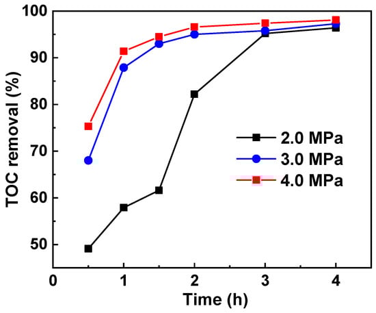 As expected, high O2 pressure benefited the catalytic reaction. At 2.0 MPa, Ru/CeO2-MOF presented poor catalytic activity as TOC removal was only 49.1% after 0.5 h reaction and could achieve approximately 95% TOC removal until a reaction time of up to 3 h. Increasing pressure can effectively enhance the activity. In the case of 3.0 and 4.0 MPa, initial TOC removal was 68.0 and 75.3%, respectively. After a 2 h reaction, TOC removal reached high values of 95.0 and 96.6%. These results further confirmed the fact that oxygen supply played an important role on the catalytic performance for CWAO of reconstituted tobacco wastewater.