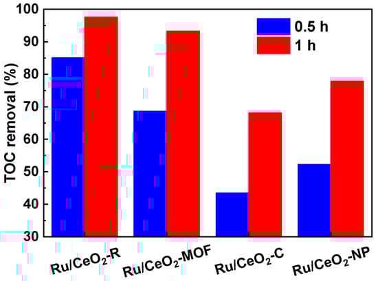 The nanostructure, shape, and morphology of the CeO2 remarkably influence the abundance and kinds of oxygen vacancies and Ce3+, which in turn affect the ability to activate O2 of CeO2 [32,33,34,35]. To further enhance the catalytic performance of Ru/CeO2, Ru/CeO2-R, Ru/CeO2-C and Ru/CeO2-NP were prepared and investigated for CWAO of reconstituted tobacco wastewater, as shown in Figure 4, with a reaction temperature of 220 °C and a pressure of 3.0 MPa.