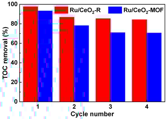 The stability of a catalyst is an important parameter in practical application. Considering the highest activity, the stability of Ru/CeO2-R was tested with a reaction temperature of 220 °C and pressure of 3.0 MPa. The results of the 1 h reaction time are shown in Figure 5, where the results of Ru/CeO2-MOF was also included for comparison. It can be seen that Ru/CeO2-MOF presented a relatively poor stability as TOC removal was decreased from 93.3% to 70.6% after 4 reaction runs. Contrary to Ru/CeO2-MOF, Ru/CeO2-R possessed a relatively better stability. At first run, TOC removal was higher than 95%. Although it was decreased to ~85% at second run, the relatively high TOC removal was maintained at third and fourth runs. This observation indicates that a rod-like CeO2 support not only resulted in high activity but also led to better stability.