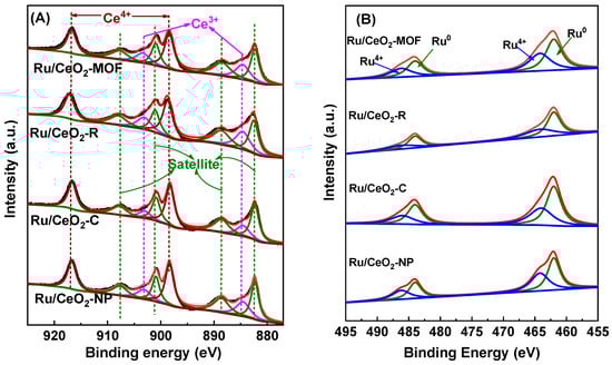 Figure 8B shows the Ru 3p XPS spectra of Ru/CeO2-MOF, Ru/CeO2-R, Ru/CeO2-C and Ru/CeO2-NP. For the four catalysts, four peaks were observed. The two peaks at 461.8 and 483.9 eV were ascribed to Ru0 and the other two peaks at 461.8 and 483.9 eV assigned to Ru4+ [38,39]. The relative portions of the surface Ru0 of the four catalysts are shown in Table 1. Contrary to Ce3+, Ru/CeO2-MOF and Ru/CeO2-R possessed lower Ru0 concentrations than Ru/CeO2-C and Ru/CeO2-NP. The possible reason was that there were more electrons transferred from Ru metal to CeO2 supports.