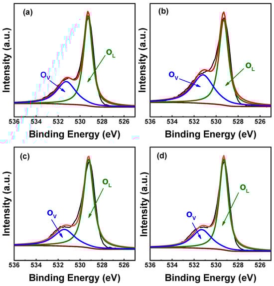 XPS spectra of O 1s for Ru/CeO2 catalysts. (a) Ru/CeO2-MOF; (b) Ru/CeO2-R, (c) Ru/CeO2-C; (d) Ru/CeO2-NP. OV: oxygen vacancies; OL: lattice oxygen.