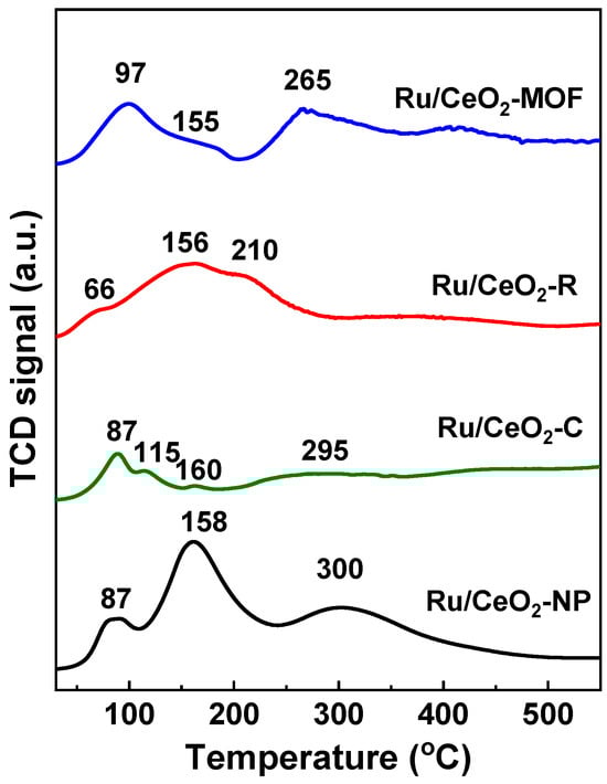 H2-TPR patterns of Ru/CeO2-MOF, Ru/CeO2-R, Ru/CeO2-C and Ru/CeO2-NP catalysts.
