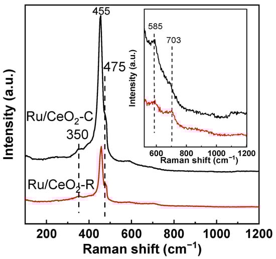The Raman spectra of Ru/CeO2-R and Ru/CeO2-C catalysts were collected to confirm the presence Ru-O-Ce species (SO-C) and the results are shown in Figure 11. For Ru/CeO2-C, four peaks can be observed. The peak at 455 cm−1 was attributed to the CeO2 supports while the one at 585 cm−1 was attributed to oxygen vacancies on the CeO2 supports [23,24,25,36]. The two peaks at 350 and 475 cm−1 can be assigned to the RuOx species [41]. For the Ru/CeO2-R catalyst, the peaks at 455, 585, 350 and 475 cm−1 were also observed. However, the intensity of the peak at 455 cm−1 was much weaker than Ru/CeO2-C. The reason was that the Ru/CeO2-R catalyst possessed a poorer crystal structure, as shown in Figure 6. It should be noted that a new peak at 703 cm−1 was observed over the Ru/CeO2-R catalyst. According to the reported results of Guo et al. [42] and Wang et al. [43], this peak was corresponding to the stretching of the Ru-O-Ce bond. Our H2-TPR results also indicated that there was reduction peak attributed to Ru-O-Ce species over Ru/CeO2-R. The results of both Raman and H2-TPR confirmed the fact that the Ru/CeO2-R catalyst contained Ru-O-Ce species while Ru/CeO2-C did not or contained very little. Clearly, the presence of Ru-O-Ce species is an important reason for the high activity of the Ru/CeO2-R catalyst.