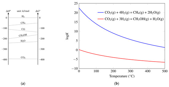 As one of the predominant greenhouse gases, CO2 has caused global environmental and energy problems, leading to an increasing focus on the conversion and utilization of CO2 [1,2,3]. Carbon dioxide represents a cheap and accessible carbon source. The efficient and economical conversion and utilization of CO2 could substantially contribute to mitigating carbon emissions and advancing sustainable development [4,5,6,7]. The standard formation enthalpy () of CO2 is −393.5 kJ/mol, and the CO2 is suitable as a raw material for chemical energy storage due to its notably low . The standard Gibbs free energy () of CO2 is −394.4 kJ/mol, further highlighting the thermodynamic stability of CO2. Therefore, the chemical conversion of CO2 requires a large amount of energy or hydrogen to facilitate the reaction. With the development of renewable energy such as wind and solar power, along with advancements in water electrolysis for hydrogen production technology, the cost of green hydrogen is experiencing a decline. This reduction in cost significantly enhances the economic viability and practicality of converting CO2 into products like methane and methanol through hydrogenation processes. Not only do these two reactions represent viable pathways for CO2 utilization, but they also hold the potential to store intermittent renewable energy as methane and methanol, serving dual roles as energy carriers and contributors to carbon emission mitigation [8,9,10,11].