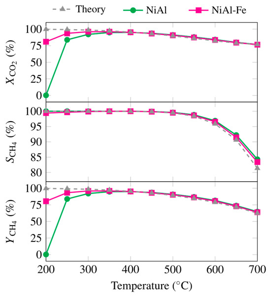 Figure 2 shows the CO2 conversion and CH4 selectivity of CO2 methanation on NiAl and NiAl-Fe catalysts. As shown in Figure 2, there is an initial increase in the CO2 conversion of both catalysts followed by a decline with further temperature rises. A distinct inflection point is observed at 400 °C in CO2 conversion. Below this temperature, the NiAl-Fe catalyst demonstrates markedly higher CO2 conversion compared to the NiAl catalyst, with the disparity widening at lower temperatures. Notably, at 200 °C, NiAl exhibits negligible activity, in contrast to the CO2 conversion of 80.9% achieved by NiAl-Fe. Above 400 °C, the CO2 conversions of both catalysts converge, approaching the theoretical value of thermodynamic equilibrium. Figure 2 demonstrates that within the experimental temperature range, the CH4 selectivity for both catalysts is quite similar, with a general downward trend as temperature increases. Below 350 °C and above 500 °C, the CH4 selectivity for the NiAl catalyst is slightly higher than that observed for the NiAl-Fe catalyst.