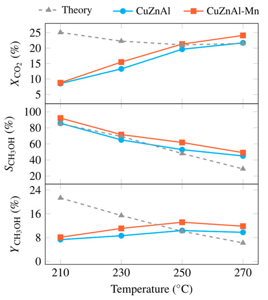 Catalytic results of CO2 hydrogenation to methanol over CuZnAl and CuZnAl-Mn at different temperatures (3 MPa, 3600 h−1).