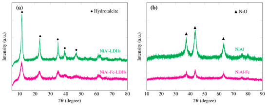 XRD patterns of (a) precursors (NiAl-LDHs and NiAl-Fe-LDHs) and (b) catalysts (NiAl and NiAl-Fe).