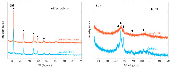 XRD patterns of (a) precursors (CuZnAl-LDHs and CuZnAl-Mn-LDHs) and (b) catalysts (CuZnAl and CuZnAl-Mn).