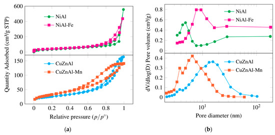 The H2-TPR results reveal that the incorporation of promoters has two principal effects. Firstly, it facilitates the reduction of active metal components, suggesting a diminished metal–oxygen binding strength in the oxides of active metal components. Secondly, it leads to an expansion of the reduction peak area, implying that the promoters either enhance the reduction of additional active metal oxides and/or are themselves reduced, consequently boosting hydrogen consumption. The reduction peak area of the two catalysts increased by nearly 10%, indicating that the promoters are more likely to participate in the reduction and consume hydrogen. Consequently, in addition to changing the catalyst texture, the promoters appear to primarily diminish the interaction between the active components and oxygen. This reduction in interaction facilitates the reduction of active components, consequently enhancing the availability of active centers. This observation is also consistent with the enhanced low-temperature catalytic performance of NiAl-Fe and CuZnAl-Mn, as depicted in Figure 2 and Figure 3.