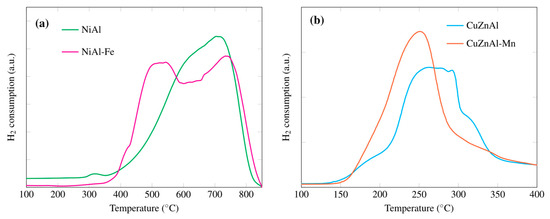 H2-TPR profiles of (a) methanation catalysts (NiAl, NiAl-Fe) and (b) methanol synthesis catalysts (CuZnAl, CuZnAl-Mn).