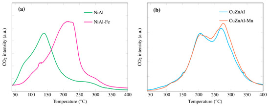 CO2-TPD profiles of (a) methanation catalysts (NiAl, NiAl-Fe) and (b) methanol synthesis catalysts (CuZnAl, CuZnAl-Mn).