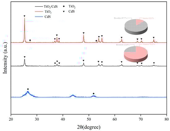 XRD patterns of TiO2, CdS, and TiO2/CdS nanocomposites.