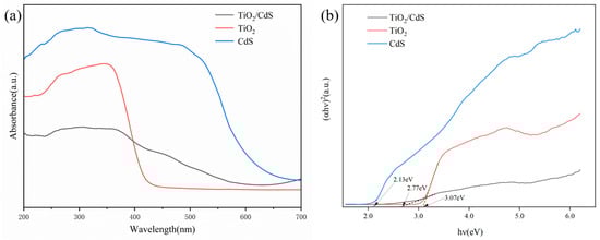 Figure 4a shows the absorption spectra of all samples in the UV–Vis range. All samples except for TiO2 exhibit strong light absorption in both the ultraviolet and visible ranges. The absorption edge of TiO2 is approximately 410 nm, while that of TiO2/CdS is at 530 nm. The bandgap widths of TiO2 and CdS were obtained using the extrapolation method, as shown in Figure 4b []. The bandgap width of TiO2 is 3.07 eV, and that of TiO2/CdS is 2.77 eV, which is lower than the 3.18 eV of TiO2/Cd prepared by previous researchers []. Compared with pure TiO2, the TiO2/CdS composite has a significantly narrower bandgap, which enables better visible light absorption.