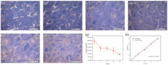 The nickel foam loaded with different layers of TiO2/CdS was observed and analyzed using a super depth microscope. The super depth of field microscope, with its large depth of field, can clearly image uneven samples. It has the unique ability to keep different heights in focus simultaneously, making it ideal for observing 3D microstructures such as catalysts. Moreover, it offers high-resolution views, enabling detailed morphological analysis and precise defect detection at the micro level. From Figure 5, it can be seen that the nickel foam has a dense pore structure. As the number of coating layers increases, the coverage of TiO2/CdS on the nickel foam also increases, and the thickness of the TiO2/CdS film on the nickel foam grows in Figure 5b–f. The surface area per unit volume was measured, as shown in Figure 5g. The number of TiO2/CdS plating layers on the nickel foam mesh exhibits a linear correlation with the TiO2/CdS catalyst dosage applied to the nickel foam mesh. This relationship can be expressed through the equation presented in Figure 5h.