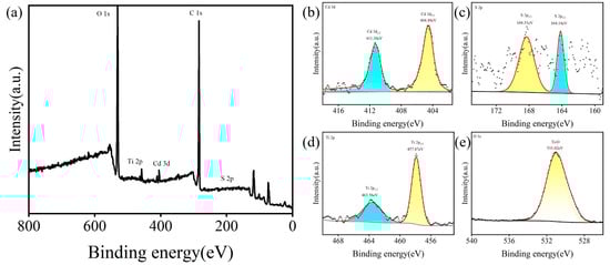 XPS was used to study the chemical states of the surface elements in the composite material, as shown in Figure 7. The full spectrum reveals the presence of Ti, O, Cd, C, and S elements in the TiO2/CdS composite material, as illustrated in Figure 7a–c, which display the high-resolution spectra of Cd 3d and S 2p, respectively. The characteristic peaks at binding energies of 404.49 eV and 411.30 eV correspond to Cd 3d52 and 3d32, indicating that the Cd element in CdS exists in the form of Cd2+. The binding energy difference of 6.8 eV between the Cd 3d52 and 3d32 peaks further confirms that the state of Cd is Cd2+ []. The characteristic peaks at binding energies of 164.18 eV and 168.31 eV correspond to S 2p12 and S 2p32, indicating that the S element in CdS exists in the form of S2− []. The Ti 2p characteristic peaks near binding energies of 457.87 eV and 463.56 eV correspond to Ti 2p32 and Ti 2p12, which are typically attributed to Ti4+, as shown in Figure 7d []. Furthermore, the binding energy difference of 5.7 eV between Ti 2p32 and Ti 2p12 further indicates that the Ti element exists in the form of Ti4+ []. Figure 7e shows the characteristic peaks at binding energies of 531.02 eV, which correspond to Ti–O bonds in the TiO2 lattice, respectively [].