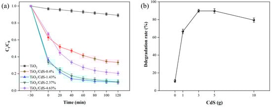 (a) Degradation rate curves at different CdS mass ratios, (b) effect of different CdS mass ratios on TCH degradation rate.