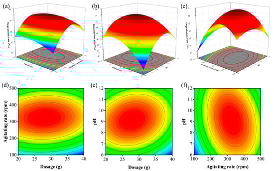 (a–f) Response surface and contour plots showing the effect of catalyst dosage, agitating rate, and pH on the degradation rate of TCH.