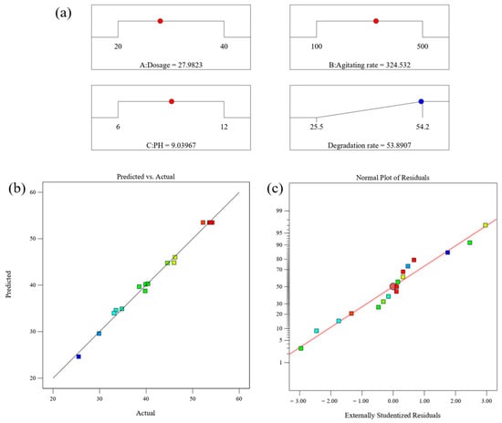 Figure 9a–f illustrate the relationships among the three factors and the degradation rate of TCH. To simplify the analysis, each figure selects two independent factors while keeping the remaining factor fixed at its midpoint value. The contour plots effectively demonstrate the interactions between the selected factors, where elliptical or saddle-shaped contours indicate significant interactions, while circular contours suggest negligible interactions. Additionally, the three-dimensional plots in Figure 9a–c provide a deeper understanding of these relationships. Figure 10a also presents the optimization results. Figure 10b shows the curve fitting of experimental and predicted TCH degradation rates along with the normal distribution of the residuals. The differences between the experimental and expected results are minimal, and the residual analysis confirms the model’s reliability. The residuals in Figure 10c appear as a straight line, indicating that the errors follow a normal distribution.