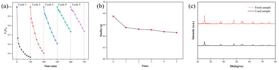 As shown in Figure 11a, the cyclic experimental results of the TiO2/CdS composite material indicate that although there is a slight decrease in photocatalytic degradation efficiency after the third cycle, the degradation rate of TCH remains relatively stable during the subsequent two cycles. After five consecutive cycles of degrading the TCH solution, the degradation efficiency decreased to 25.03%. Figure 11b shows the change in mass of the nickel foam loaded with TiO2/CdS during the continuous cycling experiments. It is evident that the mass significantly decreased after the first cycle, while the mass gradually reduced during the subsequent four cycles. This is attributed to the partial detachment of TiO2/CdS from the nickel foam during the first cycle. Notably, most TCH degradation occurred within the first 60 min of the first cycle, as loosely adsorbed TiO2/CdS particles were lost with the flow of the solution, which increased the contact area with the TCH solution, leading to a marked improvement in degradation efficiency. However, as more particles detached, the solution’s transparency decreased, resulting in a decline in degradation efficiency after 90 min of the first cycle. In the following four cycles, the concentration of TCH steadily reduced during the photocatalytic reaction, indicating minimal detachment of TiO2/CdS particles, which correlates with the slow reduction in the mass of the nickel foam loaded with TiO2/CdS. The observed decrease in photocatalytic performance may be due to surface area loss from nanoparticle agglomeration and particle detachment from the nickel foam. There may also be slight changes in the structure of TiO2/CdS or accumulation of reaction byproducts on its surface during the photocatalytic process, which could affect the degradation efficiency in multiple cycles.