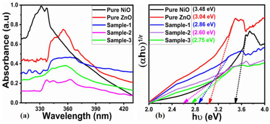(a) UV-visible absorption spectra of spectra of pure ZnO, NiO, and its composites with 0.3 g, 0.6 g, and 0.9 g of NiO using 10, 15, and 20 mL of date fruit juice, respectively. (b) Tauc’s plots.