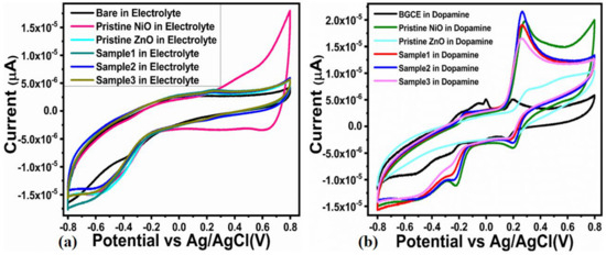 We used a phosphate buffer at a pH of 7.3 as a supporting electrolyte and performed CV at a scan rate of 0.05 V/s. Using this method, the electrochemical signal of NiO/ZnO based hybrid materials was evaluated for the detection of dopamine. Hybrid systems consisting of 0.3, 0.6, and 0.9 g of NiO labeled as Samples 1, 2, and 3 were compared to pristine NiO and ZnO for a performance evaluation during non-enzymatic dopamine detection. Figure 5a illustrates that the bare glassy carbon electrode (BGCE) exhibits negligible redox signals in the electrolyte and analyte. Further, the pristine NiO and ZnO nanomaterials and their respective hybrid materials, did not exhibit any redox behavior in the electrolyte. However, pristine ZnO did not show any redox behavior in the 0.1 mM dopamine, whereas pristine NiO gave off an oxidation signal. Sample 2 showed a stronger oxidation signal for dopamine, indicating its excellent electrocatalytic properties, as shown in Figure 5b. Because of their capping, reducing, and stabilizing properties, the reducing agents in date fruit juice are highly active in transforming and modifying the surface properties of nanostructures. Sample 2 contained 0.6 g of NiO and a date fruit volume 15 mL as an optimum volume. Further increases in the volume of date fruit juice could reduce the catalytic sites and limit the activity of the hybrid system, hence 20 mL of date fruit juice showed relatively poor performance. Furthermore, the surface aspects of hybrid systems were significantly modified, as witnessed by the CV curves during the evaluation of the samples’ electrocatalytic properties. The composite system facilitates the electro-transfer rate via synergetic effects through the favorable interfacial chemistry. The composite carried the multiple catalytic sites’ contribution from both ZnO and NiO. Hence, improved electrocatalytic performance was noticed for the composite system.