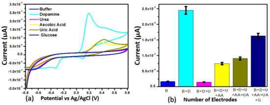 The aim was to evaluate the dopamine selectivity of the hybrid material (Sample 2) based on NiO and ZnO, as shown in Figure 9a. An interference study was conducted using 0.1 mM dopamine and a similar concentration of potential interference species. The CV curves recorded at 50 mV/s revealed changes in peak currents associated with dopamine drug peak currents. As shown in Supplementary Table S1, which shows the recorded changes in the electrical signal, (G) glucose, (U)urea, (AA) ascorbic acid, and (UA) uric acid had little to no effect on the peak current. Similarly, the peak current of each interfering agent was compared with the dopamine electrical signal via bar graph representation, as shown in Figure 10b. It was performed in one container for the solution; all of the interfering agents were added sequentially, as shown in Figure 9b. It was seen clearly that compared to (D), the dopamine peak current, the peak current produced by the other interfering substances was very much lower and at different oxidation potentials, indicating that Sample 2 selectively quantified the dopamine.