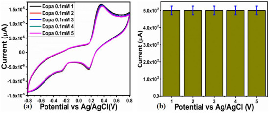 To determine the reproducibility of a non-enzymatic sensor, the CV curves of Sample 2 at 50 mV/s and 0.1 mM dopamine concentration are shown in Figure 10a, which depicts the inter-electrode response. It was observed that the electrochemical behavior of each electrode was almost the same, with negligible variations in the peak current, peak potential, and the area of the peak, demonstrating that Sample 2 displays consistent electrochemical activity, which further validates the accurate medication of the electrode with Sample 2. In Figure 10b, the bar graph illustrates the variations of the peak current of each inter-electrode response. As seen in the figure, the variation in the peak of each electrode modified with Sample 2 is less than 3%, indicating that the electrode is accurate and precise for measuring dopamine. Additionally, 28 repeatable CV curves were performed at 50 mV/s in 0.1 mM dopamine. The results are shown in Figure 11a. Once again, Sample 2’s performance confirms that it fully covers the electrode with a high degree of compatibility. It is evident that the date fruit juice is acting as a bio-mimic and that carbon was inserted during thermal annealing, which led to the uniform distribution of material during the preparation of the catalyst ink. As shown in Figure 11b, the peak current of each CV curve is plotted as a bar graph to provide a better understanding of the variation in current. The peak current variation was found to be negligible, demonstrating the excellent compatibility of Sample 2, which is responsible for its high stability.