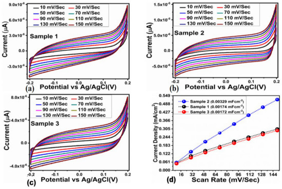 An evaluation of electrochemical active surface area (ECSA) values was conducted to understand the reason for the enhanced electrochemical performance of Sample 2 in the oxidation of dopamine. Figure 12a–c illustrates the CV curves for Sample 1, Sample 2, and Sample 3 of the hybrid materials as measured at various scan rates in a non-Faradic region. In the given potential window range, all of the CV curves are well-shaped into non-Faradic regions.