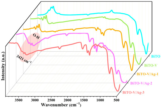 As shown in the Fourier transform infrared (FTIR) spectra (Figure 1), the successful loading of Ag NPs resulted in a broad absorption peak at 3421 cm−1, corresponding to hydrated hydroxyl groups on the BTO-V surface. Additionally, the O-H bending vibration peak at 1632 cm−1 became more pronounced with increasing Ag NP loading [30,39,40]. The results indicated that increasing Ag NP loading enhanced the hydrophilicity of the composite catalyst, facilitating its dispersion in the aqueous phase and promoting material exchange.