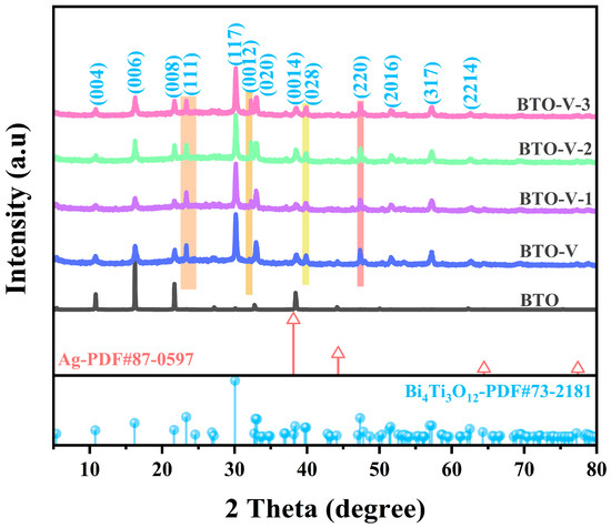 The crystal structure of the samples was analyzed using XRD. As shown in Figure 2, the diffraction peaks clearly correspond to the orthogonal structure of Bi4Ti3O12 (JCPDS No. 73-2181, a = b = 5.41 nm, c = 1.38 nm). The samples exhibited well-defined crystal structures, with no impurity phases, such as bismuth oxide or other oxides, detected. Notably, the diffraction peak at the (117) crystal plane was significantly enhanced after the formation of oxygen vacancies. This enhancement may be due to the lamellar structure of the original BTO, which has lower interlaminar binding energy along the c-axis [30,41]. As a result, the sample tends to stack and grow perpendicular to the c-axis, with the exposed primary crystal plane being (006). However, the introduction of oxygen vacancies alters the orientation of the BTO-V crystal, causing the BTO-V planes to contract and expose more active crystal planes. Furthermore, no corresponding diffraction peak from Ag NPs was observed in the BTO-V/Ag Schottky heterojunction. This absence may be attributed to the small particle size of Ag NPs and the strong diffraction intensity of BTO. Furthermore, the thickness of the fabricated composite catalyst, as calculated by the Scherrer formula (Table S1 and Equation (S1)), closely aligns with the findings obtained from the FE-SEM analysis. The thickness of BTO-V nanosheets is approximately 30 nm.