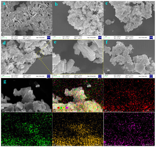 FE-SEM images of the (a) BTO, (b) BTO-V, (c) BTO-V/Ag-1, (d,e) BTO-V/Ag-2, and (f) BTO-V/Ag-3. (g) The corresponding EDS maps of BTO-V/Ag-2.