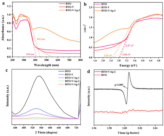 The optical properties of the prepared materials were characterized using the UV-vis DRS method. As shown in Figure 4a, the absorption edges of BTO and BTO-V occur around 410 nm. However, the introduction of oxygen vacancies causes a significant redshift at the lower absorption edge of the BTO-V curve [37,44]. The incorporation of Ag NPs into BTO-V leads to a widening of the absorption edge to 445 nm in the BTO-V/Ag-2 composite with a Schottky junction. The corresponding linearity of the Tauc plots ((αhv)2 ~ hv) confirms the optical bandgap of BTO, BTO-V, and BTO-V/Ag-2, respectively (Figure 3b, Equation (S2)). From the intercept of the tangent to hv, the bandgap (Eg) of BTO, BTO-V, and BTO-V/Ag-2 was estimated to be 2.87, 2.84, and 2.52 eV, respectively [27,44]. These results indicate that the composite catalyst exhibits a strong response to visible light. To further investigate the photocatalytic properties of the samples, steady-state photoluminescence (PL) was measured under 375 nm excitation. As shown in the PL image of Figure 4c, BTO-V/Ag-2 displays the minimum absorption intensity. This result clearly demonstrates that the recombination rate of electrons and holes in BTO-V/Ag-2 is the minimum among the samples investigated. Typically, such a low recombination rate implies that BTO-V/Ag-2 has an outstanding photoelectric separation efficiency, thereby conferring upon it the optimal photocatalytic performance. Moreover, oxygen vacancies are formed as a result of the consumption of lattice oxygen in BTO. This consumption occurs due to a reaction with ammonia gas, which is generated by the thermal decomposition of urea. To directly confirm the presence of oxygen vacancies, an electron paramagnetic resonance (EPR) analysis was conducted. As shown in Figure 4d, the BTO-V/Ag-2 sample exhibits a clear EPR signal at g = 2.001, which is commonly recognized as a signature of electrons trapped in oxygen vacancies [30,45,46].
