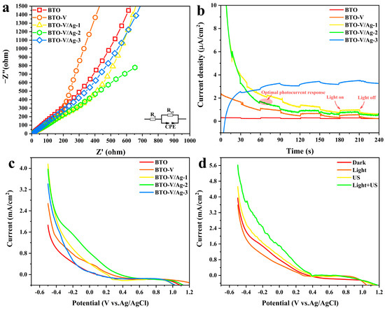 The arc radius of BTO-V/Ag-2 was significantly reduced in electrochemical impedance spectroscopy (EIS) (Figure 5a). The results indicate that the ion and electron transfer resistances are low, demonstrating that the sample exhibits good electron transfer performance. Carrier dynamics were analyzed using a photoelectrochemical method. After the construction of Schottky structures, both BTO-V/Ag samples exhibited improved transient photocurrent responses (Figure 5b), suggesting that the photocarrier separation effect of the composite was significantly enhanced compared to that of BTO and BTO-V monomers. Furthermore, we evaluated the electrochemical properties of the samples under various conditions to assess the synergistic effects of piezoelectricity and light. BTO-V/Ag-2 was found to have optimal electron transport capacity, as determined by linear sweep voltammetry (LSV) (Figure 5c,d). Moreover, BTO-V/Ag-2 exhibited the highest current density under the synergistic mechanism of piezo-photocatalysis, further confirming the effectiveness of piezo-photocatalysis in enhancing charge separation and transport. This cooperative mechanism facilitates the generation of more effective photogenerated electrons and holes, which promote the production of various active species [47,48].