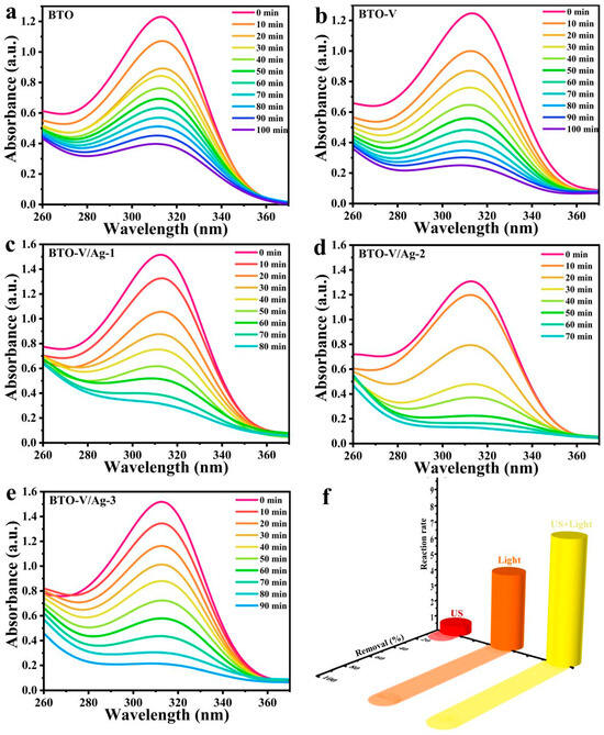 (a–e) Time-varying UV–Vis spectrum for the eliminate reaction of NZTD under the catalysis of BTO, BTO-V, BTO-V/Ag-1, BTO-V/Ag-2, and BTO-V/Ag-3, respectively (the annotation at time 0 corresponds to 20 min of dark adsorption). (f) BTO-V/Ag-2 catalytic performance of NZTD removal under different excitation conditions.
