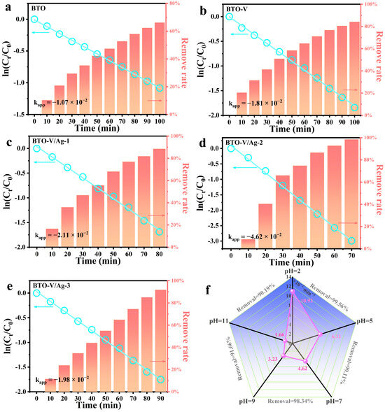 (a–e) Plot of ln(C0/Ct) against t for the catalytic process of NZTD with BTO, BTO-V, BTO-V/Ag-1, BTO-V/Ag-2, and BTO-V/Ag-3, respectively. (f) Effects of pH of solution on removal of NZT (with HCl and KOH).