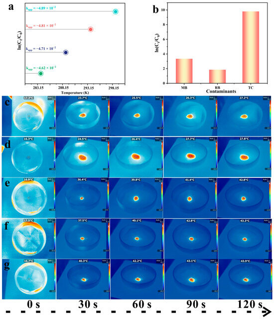 (a,b) Reaction rate plot of BTO-V/Ag-2-catalyzed degradation performance at different temperatures and contaminants. (c–g) Infrared thermal images of BTO-V/Ag-2 at different time resolutions (0, 30, 60, 90, and 120 s).