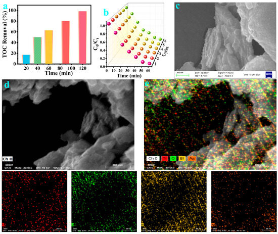(a) TOC removal efficiencies of NZTD; (b) catalytic degradation removal rate curve of BTO-V/Ag-2 catalyst. (c) FE-SEM topography of BTO-V/Ag-2 after six cycles of catalysis and (d,e) corresponding EDS maps.