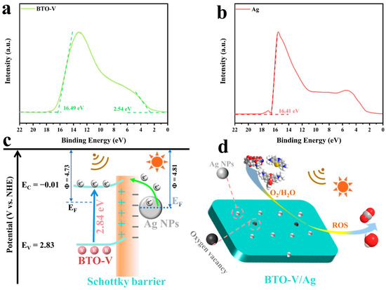 Through the ultraviolet photoemission spectroscopy instrument (UPS) test presented in Figure 10, the work function values of BTO-V and Ag NPs are determined to be 4.73 V and 4.81 V (vs. normal hydrogen electrode (NHE)), respectively. Consequently, when Ag, which has a relatively large work function, comes into contact with the n-type semiconductor BTO-V, free electrons transfer from BTO-V to Ag. This transfer occurs to achieve the equilibrium of the Fermi levels (EF) between the two materials [27,28]. This results in the formation of an electron accumulation layer near the Ag side and an electron depletion layer near the BTO-V side. Consequently, the energy bands of BTO-V bend, eventually forming a Schottky barrier with an internal electric field structure. The direction of the built-in electric field is from the semiconductor towards the metal. When photogenerated carriers are generated, the built-in electric field effectively separates the electrons and holes. The photogenerated electrons move toward the conduction band of the semiconductor, while the holes move in the opposite direction. This reduces the recombination rate of electrons and holes, enabling a greater number of photogenerated carriers to participate in the catalytic reaction. Furthermore, piezoelectricity can induce the further bending of the energy bands, leading to the generation of more powerful reactive oxygen species (ROS) [55]. Oxygen vacancies regulate the band gap structure of BTO-V by acting as electron traps, facilitating carrier separation. The final composite catalyst can degrade organic pollutants into water, carbon dioxide, and some inorganic salts under piezoelectric photocatalysis.