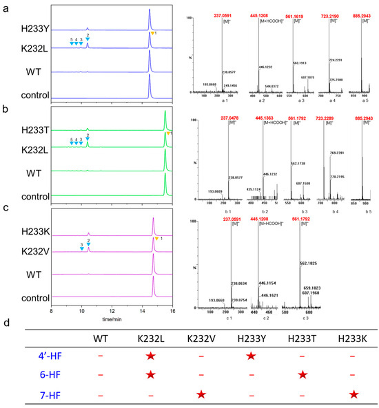 HPLC and LC-MS analysis of glycosylated products using PmCGTase WT and variants with three monohydroxy flavones as substrates. (a) Analysis with 4′-HF substrate; (b) analysis with 6-HF substrate; (c) analysis with 7-HF substrate; (d) the specificity of variants to different substrates. Products were detected using [M+HCOOH]− mode, confirming the formation of corresponding derivatives. Short red line represents no specificity to the corresponding substrate; red pentagram represents specificity to the corresponding substrate.