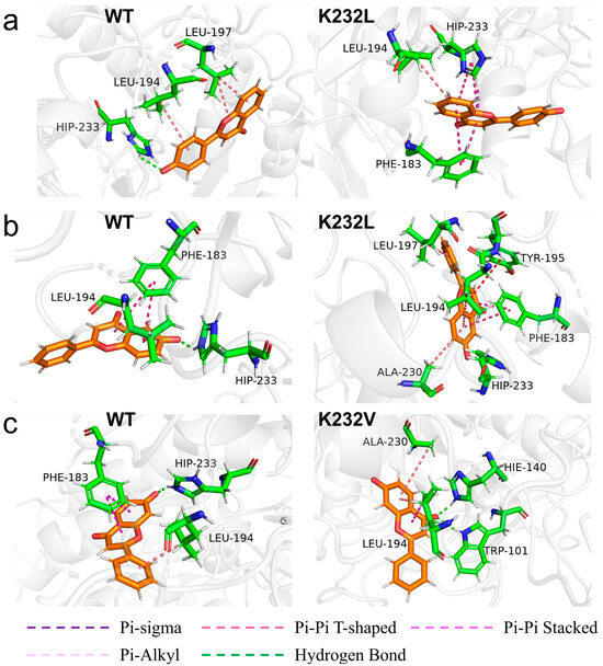 The variants exhibited improved residue interactions with the substrate, contributing to enhanced stability during catalysis. For K232L, the π-π interactions between Y195 and the flavonoid acceptor were strengthened, stabilizing the substrate and supporting regioselective glycosylation (Figure 5). This is consistent with the previous studies identifying Y195 as a critical residue influencing hydrolytic activity and cyclization specificity in α-CGTase [30]. Additionally, K232L displayed π-π interactions between A230 and the substrate, with side-chain interactions influencing the cyclodextrin specificity [31]. The enhanced interactions likely contributed to the increased conversion of K232L and K232V, reinforcing the functional significance of these residues in substrate stabilization and regioselectivity.