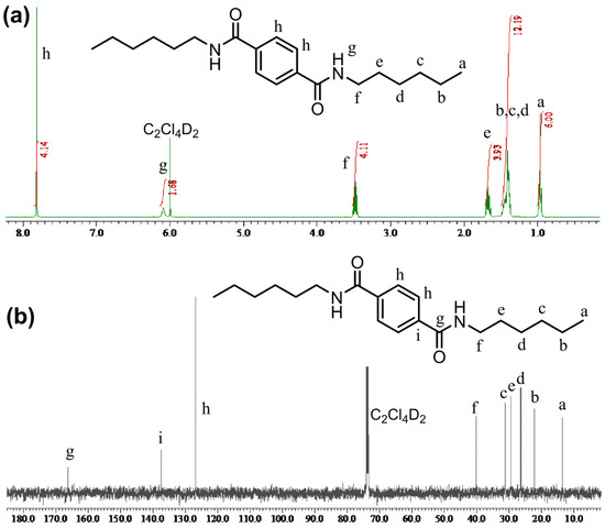 (a) 1H-NMR spectrum and (b) 13C-NMR spectrum for N,N′-di(n-hexyl) terephthalamide (in tetrachloroethane-d2 at 100 °C).