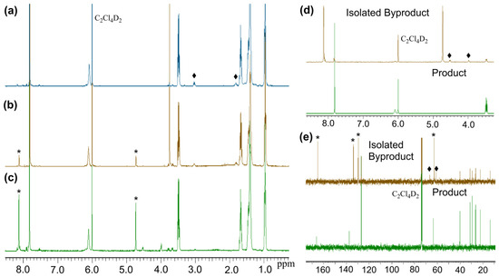 (a–c) 1H NMR spectra of the reaction mixture (after removal of volatiles) in the reaction of PET with n-hexylamine (130 °C, 6 h) in the presence of 2.0 mol% Cp*TiCl3 (a) after 48 h (run 2); (b) 6 h (run 6), and (c) after 6 h in the absence of catalyst (run 7). (d) 1H-NMR spectrum and (e) 13C NMR spectra (in tetreachloroethane-d2 at 100 °C) for isolated byproduct (PET oligomer) separated from the reaction mixture conducted at 100 °C (runs 8,9). Resonances marked with * corresponded to byproduct (PET oligomers), and peaks marked with ◆ are impurities.