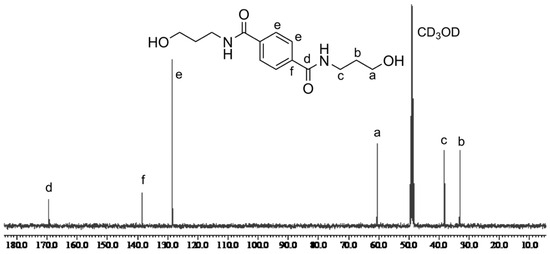 Reactions of PET with 3-amino-1-propanol were conducted at 100 or 130 °C in the presence/absence of a Cp*TiCl3 catalyst, and the results are summarized in Table 3. It was revealed that the reaction product was exclusively N,N’-bis(3-hydroxy) terephthalamide, 1,4-[HOCH2CH2CH2NC(O)]C6H4, as shown in Figure 3 (13C NMR spectrum) as well as Figure S5, Supplementary Materials [51]. The pure isolation of the amide seemed rather difficult because the separation of the product with 3-amino-1-propanol remained even after the removal of volatiles in vacuo. Therefore, repetitive precipitation with chloroform was required (the reason for rather low yields compared to those in the reaction with n-hexylamine). The reason for the exclusive obtainment of amide instead of ester would be due to the stability of the product (amide is more stable thermodynamically compared to esters).