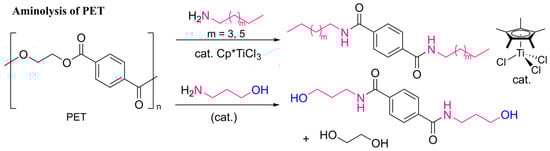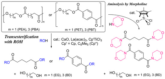 More recently, the acid- and base-free depolymerization of PET [40,41,42] as well as conventional polyesters [44,45,46,47] with alcohols have been demonstrated in the presence of La(acac)3 (acac = acetylacetonato) [40,46], CaO [42,45], or Cp’TiCl3 (Cp’ = Cp, Cp*) [41,44]. Moreover, FeCl3-catalyzed depolymerization has been demonstrated not only in PET bottles but also in textile waste consisting of PET with ethanol [47]. This depolymerization and transesterification with alcohols (ethanol, methanol, cyclohexane methanol, etc.) afforded the corresponding monomers exclusively (Scheme 2, >99% conversion, >99% selectivity). We also reported that PET was treated with morpholine in the presence of Cp*TiCl3 to give the corresponding amide in high yields [48].